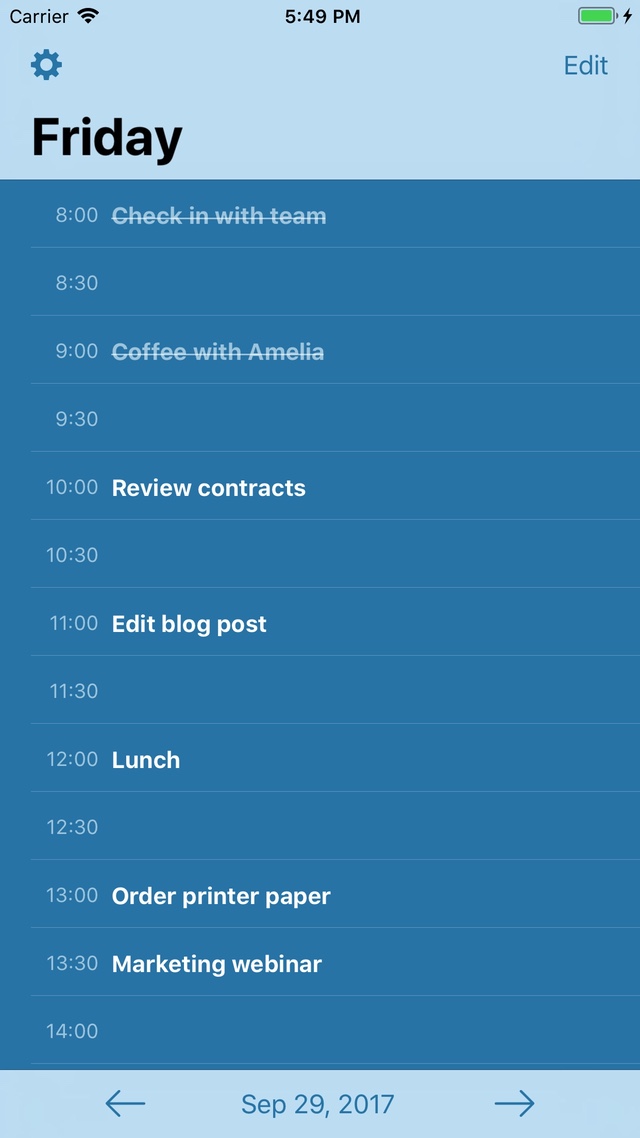 Plan your day quickly with Long Day. Add tasks to each time block without having to close your keyboard. Long Day is designed for the hour by hour tasks you have to get done today, so you can keep your other calendar app free for far off appointments and birthdays.